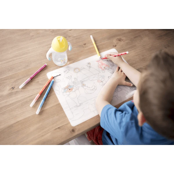 Terwijl uw kind op het eten wacht, kan het de leuke plaatjes inkleuren met de in water oplosbare viltstiften. Zodra het eten arriveert, houdt het de tafel mooi schoon – zonder weg te glijden.