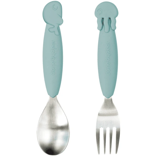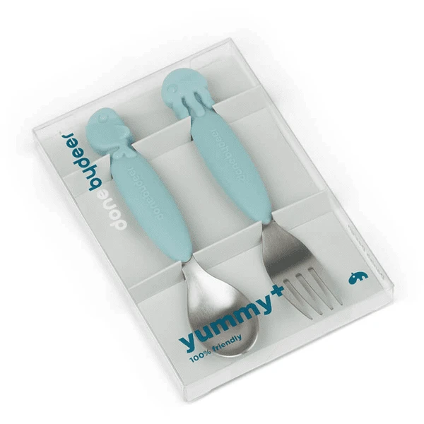 De schattige Yummy+ bestekset met lepel en vork biedt een stevige grip en helpt kleine eters zich te concentreren op de taak die ze moeten uitvoeren. Om zelfstandig leren eten zo leuk mogelijk te maken, zijn de juiste hulpmiddelen onmisbaar. De schattige jelly vork en wally lepel hebben zachte, anti-slip handgrepen en zullen snel een favoriet setje worden. Het formaat van de kinderbestekset is perfect voor uw peuter die leert zichzelf te voeden en voor de komende jaren. Het bestek Sea friends is zacht pastelblauw dat goed past bij het Done by Deer kinderservies.