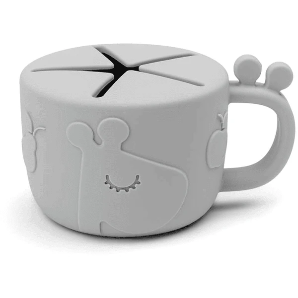 De grijze beker is erg praktisch voor kleine snacks voor onderweg. Uw kind kan het handvat met één hand vasthouden terwijl de andere reikt naar snacks. Praktisch in de kinderwagen, in de auto en voor uitstapjes.