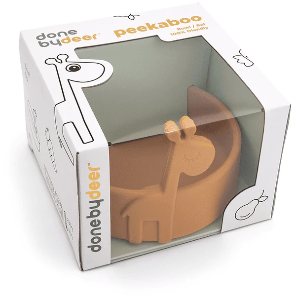 Kiekeboe, het is tijd om te eten! Raffi komt tevoorschijn uit de schattige en praktische siliconen kom, klaar om van het eten een extra leuk moment van de dag te maken. Met zijn grote hoogte en afgeronde binnenranden is het kommetje ideaal om gemakkelijk in te scheppen wanneer het kind zelfstandig leert eten. De schattige kom is gemaakt van siliconen van levensmiddelenkwaliteit, waardoor het splintervrij is en geschikt voor de magnetron, oven, vriezer en vaatwasser, en het heeft bovendien antislip-eigenschappen. De duurzame siliconen kom is perfect voor het opwarmen van babymaaltijden. De kleintjes zullen de schattige giraf graag bij zich hebben als ze eten – en pas op, een lange nek is perfect om een hapje te stelen. De praktische kom is afgewerkt in zacht mosterdgeel, passend bij de Peekaboo serviescollectie en wordt geleverd in een schattig versierde geschenkverpakking.
