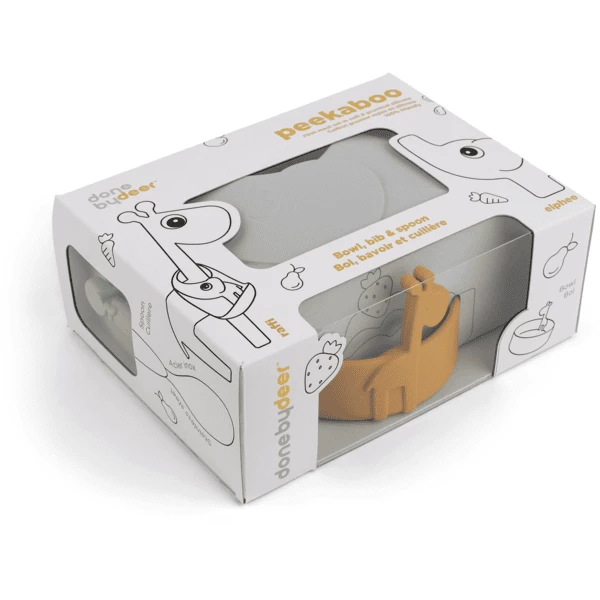 De Peekaboo set voor de eerste maaltijd is ontworpen om de nieuwsgierigheid van kleine eters te wekken. Elphee en Raffi gluren uit de afwas – en maken van de maaltijd een extra leuk moment van de dag. Een perfecte maaltijdset voor de eerste maaltijden en om te leren zichzelf te voeden. De schattige kom, lepel en praktische slab zijn gemaakt van voedselveilige siliconen, waardoor de set breukvast en magnetronbestendig is, en bovendien antislip en anti-slip eigenschappen heeft. De set heeft praktische details die het voeden ondersteunen. De kleintjes zullen het leuk vinden om de grappige dieren bij zich te hebben als ze eten – laat Elphee’s zak het eten opvangen dat verloren gaat en laat Raffi hen aanmoedigen om de spannende mijlpaal van zelfstandig eten te bereiken.