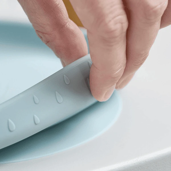 Op het blauwe bord, de beige kom sand en de mosterdgele mini beker staan Elphee, Raffi, Birdee, waterdruppels en dromerige wolken afgebeeld. Met lichte druk kleven de plaat en kom op de meeste gladde oppervlakken. Dit voorkomt dat het kind ze kan verplaatsen, kantelen of gooien.
