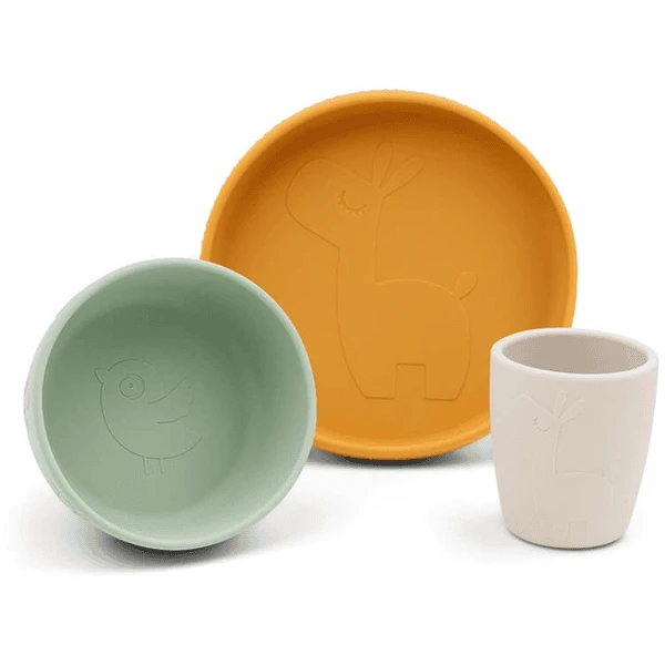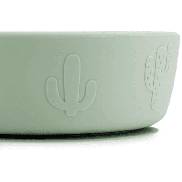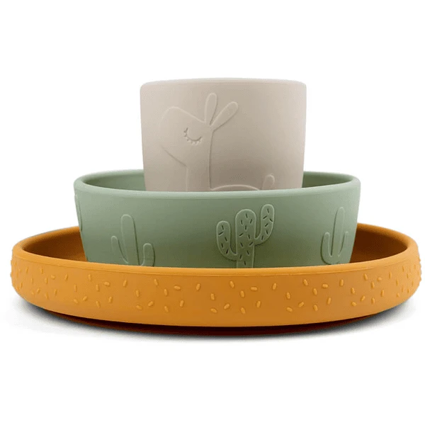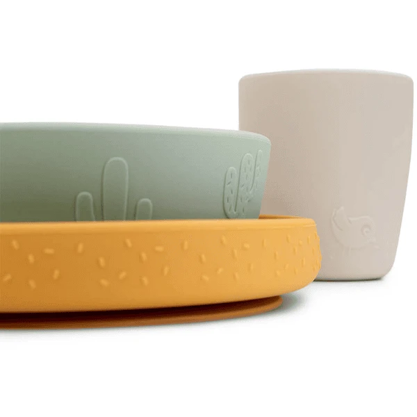 Op het mosterdgele bord, de groene kom en de beige minikop sand staan Lalee, Birdee, leuke confetti en cactussen. Met lichte druk kleven de plaat en de kom op de meeste gladde oppervlakken. Dit voorkomt dat het kind ze kan bewegen, kantelen of gooien.
