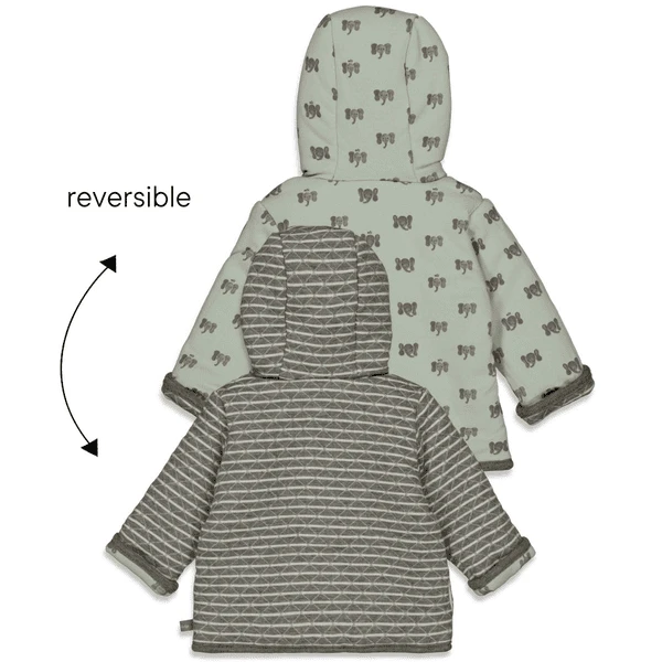 Prachtig omkeerbaar jack met capuchon en twee verschillende Design s. Op de ene kant staat een schattige olifant Allover print en de andere kant is gestreept. Afgewerkt met grijze biesjes en een drukknoopsluiting voor gemakkelijk aan- en uittrekken. Beide kanten hebben een coole look en zijn ideaal te combineren met verschillende outfits.