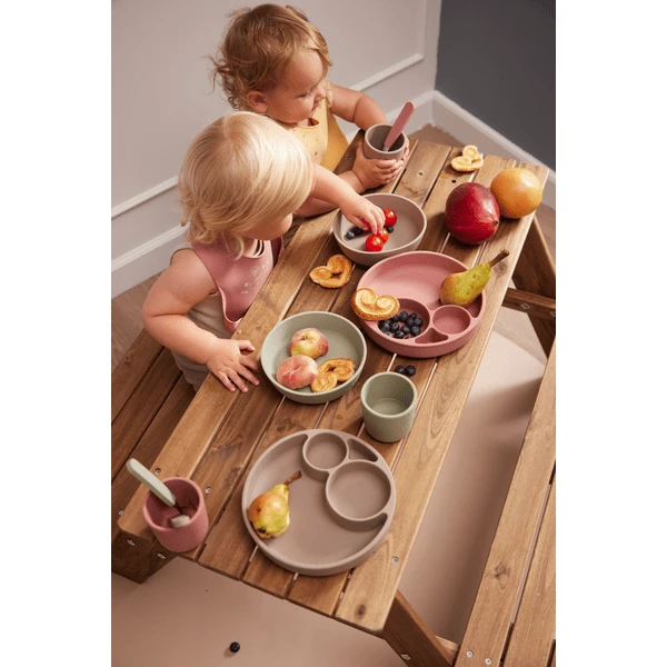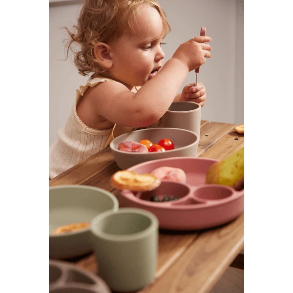 - De kom is gemaakt van 100% silicone en heeft een zacht oppervlak dat aangenaam aanvoelt en uw kind helpt om het bestek gemakkelijk in de kom te verplaatsen.