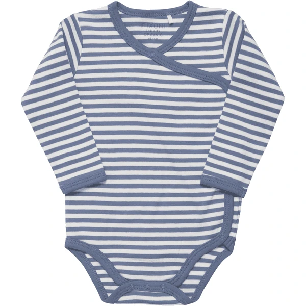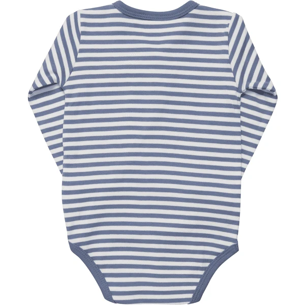 Mooi lijfje met lange mouwen in blauw met coole strepen. Drukknopen maken het gemakkelijk aan en uit te trekken.