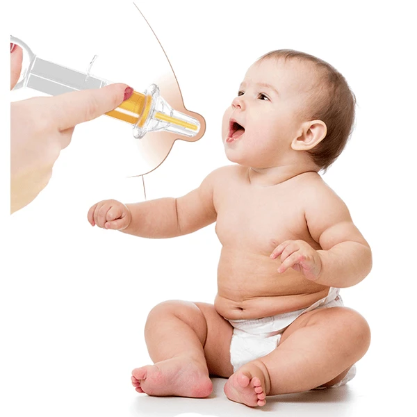 - Zijdelingse openingen op de speenpunt verspreiden het medicijn naar de zijkant van de mond in plaats van recht in de keel
