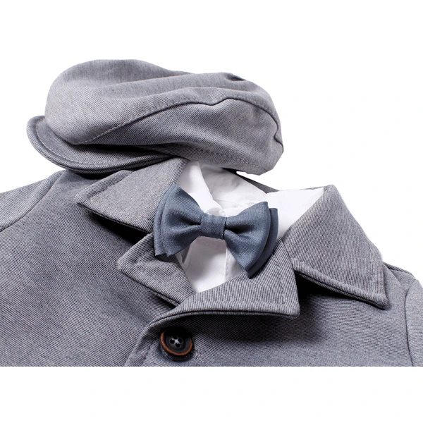 Het chique en toch nonchalante witte shirt met lange mouwen past goed bij het modern en grijze, bruine kinderpak. Het kleine blauwgrijze vlinderdasje en de grijze pet ronden de feestelijke outfit voor de doop en andere festiviteiten af en zorgen voor de perfecte uitstraling.