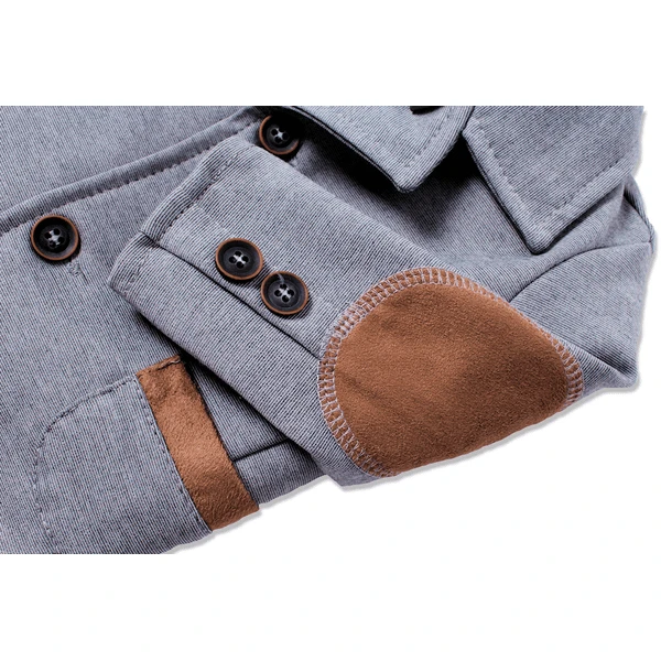 De jas van het pak kan ook gemakkelijk worden gesloten en heropend door de twee elegante knopen. Op het voorste deel van het jack zitten links en rechts twee kleine zakjes. De jaszakken zijn bovendien voorzien van bruine applicaties, die ook op de ellebogen te vinden zijn in bijpassende kleuren als patch.