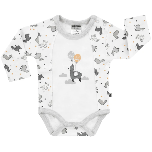 Mooie wikkelbody met lange mouwen en doorlopende drukknopen en lama Print ’s aan de zijkant en de mouwen, de drukknopen maken het aan- en uitkleden en het verschonen van de luiers gemakkelijker. Op de voorkant staat ook een schattig lama-motief. Gemaakt van zacht katoen.