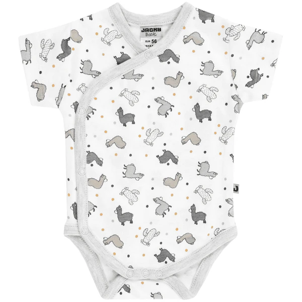 Mooie wikkelbody met korte mouwen en een doorlopende drukknoopsluiting, die het aan- en uitkleden en het verschonen van de luiers vergemakkelijkt. Super schattig -lama Allover patroon. Het lichaam is gemaakt van zacht katoen.