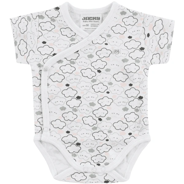 Mooi rompertje met korte mouwen en over de hele lengte een strook met drukknopen, die het aan- en uitkleden en het verschonen vergemakkelijken. Het lichaam is bedrukt met kleine wolkjes en kleine, roze details.