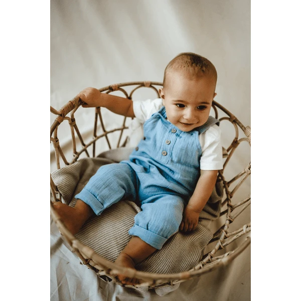 - Aandacht voor detail: Het kleine decoratieve knopenpaneel op de borst en de twee kleine kangoeroezakken op de buik geven de tuinbroek die extra speciale touch.