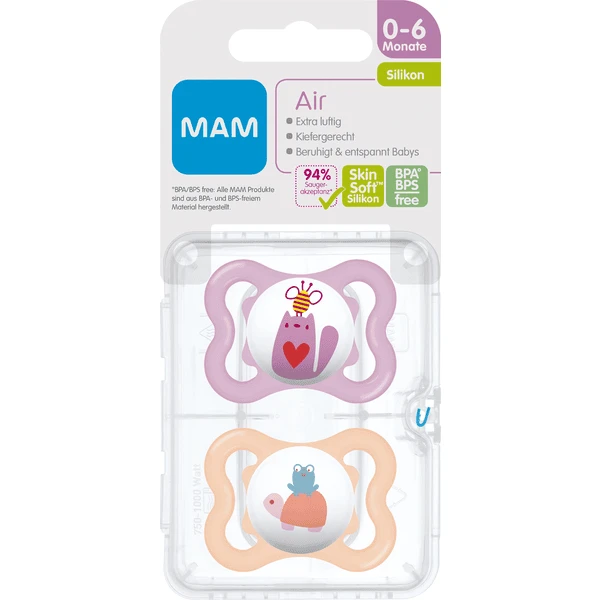 - Bij de MAM fopspeen Air Silicone in een set van 2 wordt speciale aandacht besteed aan het vermijden van huidirritatie dankzij een innovatieve Design