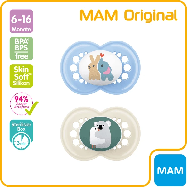 - Met zijn trendy kleuren en motieven zal de MAM Original siliconen fopspeen set van 2 snel een geliefd onderdeel worden van de uitrusting van uw baby.