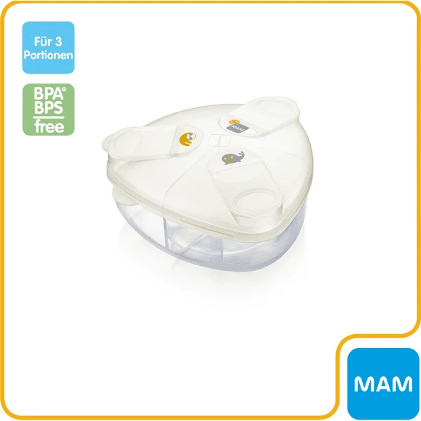 Het dagelijks leven met uw baby kan hectisch zijn. Vooral als je kleintje honger heeft, moet het snel gaan en heb je niet altijd beide handen vrij. Met de MAM melkpoederdispenser kan de juiste hoeveelheid melkpoeder eenvoudig worden geportioneerd en is altijd bij de hand. Indien nodig kunt u een zuigfles gemakkelijk met één hand vullen. Dankzij de innovatieve driehoekige vorm blijft er geen poederresidu achter in de container. De box heeft 3 compartimenten en biedt dus ruimte voor 3 porties babyvoeding met elk maximaal 40 g. Bovendien is de container bijzonder plat en licht en vindt daardoor ruimte in elke luiertas – ideaal voor onderweg. De kliksluitingen zijn eenvoudig te openen en te sluiten en houden toch een goede afsluiting. Voor een eenvoudige bediening is de melkpoederdoos steriliseerbaar en vaatwasmachinebestendig. Als de melkpoederautomaat niet nodig is voor babyvoeding, kan deze ook worden gebruikt voor het bewaren van snacks, fopspenen of flessenspeentjes.