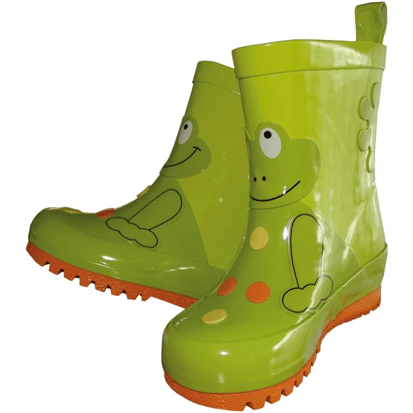 Prachtige rubberen laars met leuk kikkermotief in aragongroen zonder manchet – zodat uw kind ook bij slecht weer buiten kan spelen en ravotten.