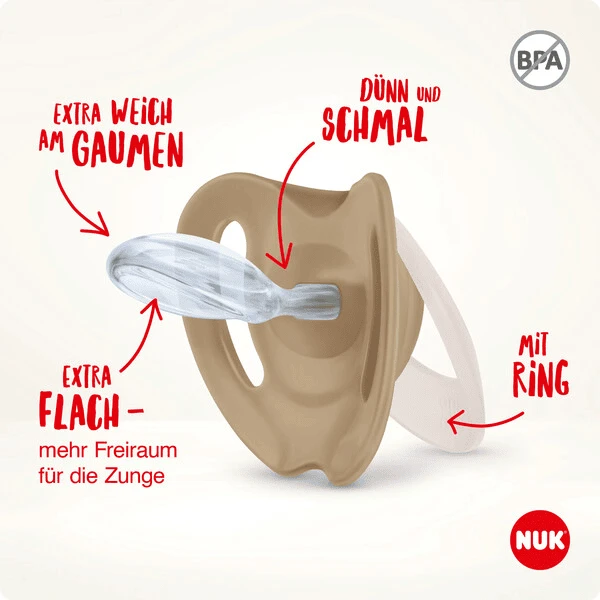 - Original NUK Vorm – rond aan de bovenkant en plat aan de onderkant, laat ruimte voor natuurlijke zuigbewegingen