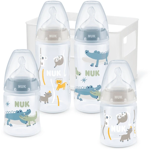 De set bevat vier NUK First Choice + Temperature Control babyflessen van polypropyleen (PP) met leuke motieven: Voor de kleine honger twee flessen van elk 150ml en nog twee met elk 300ml vulcapaciteit. De babyflessen van PP zijn licht en resistent. Door de easy-grip schroefring zijn de flessen gemakkelijk te openen en te sluiten. Door de wijde hals is de fles gemakkelijk te vullen en schoon te maken.