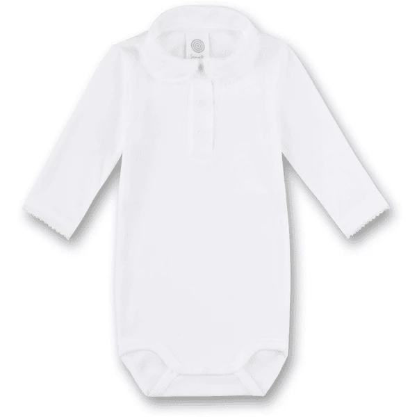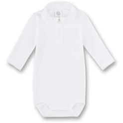 Lief, wit lijfje met lange mouwen met kraag en knoopsluiting. Dit lichaam heeft praktische drukknopen in het luiergedeelte die het aan- en uittrekken vergemakkelijken.