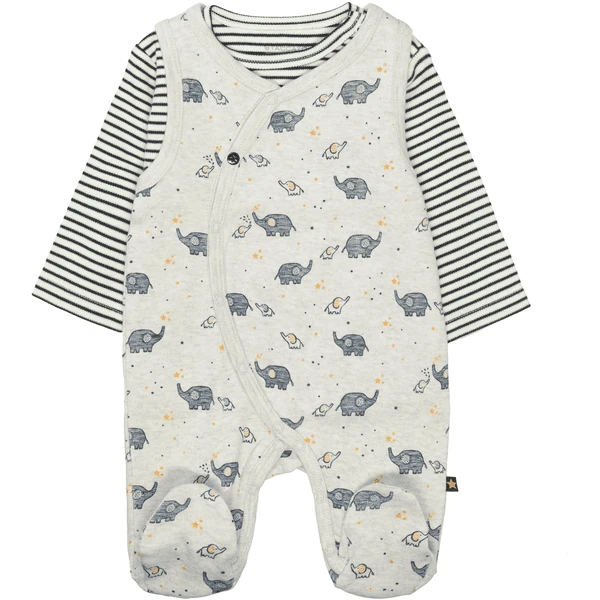 Deze schattige romper en shirt set zal uw baby’s nieuwe must-have zijn! Het gedessineerde rompertje met olifantenapplicatie harmonieert wonderwel met het gestreepte hemdje met lange mouwen. De drukknopen op de schouder en in het kruis maken het aan- en uittrekken gemakkelijk.